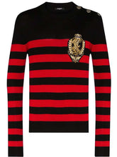 Оригинален мъжки артикул: Пуловери - от марката Balmain. Състав: 65% вълна 35% памук. Висококачествен външен вид, уникален и елегантен. Модел: red and black striped shirt.